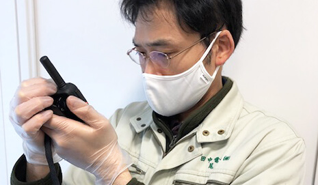 初めてのお客様・リピートで利用するお客様に気持ちよく利用していただく為に、田中電気のレンタル無線機は1台1台を徹底的に分解掃除・消毒・除菌しています。