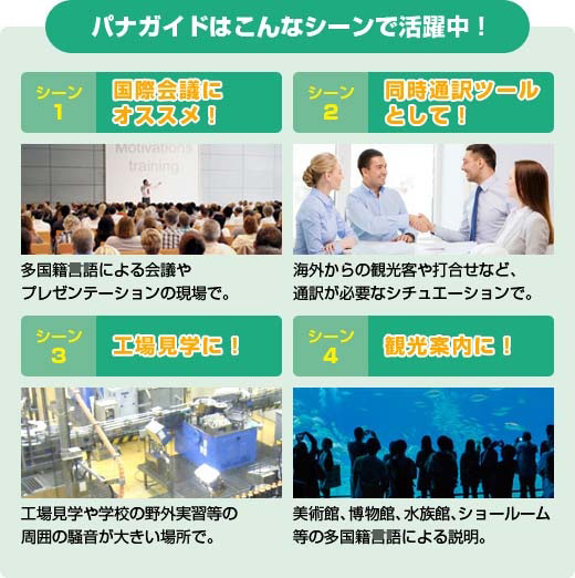 工場・施設見学、美術館・博物館での使用や、多言語での説明会・国際会議などの同時通訳の際に通訳者との橋渡しとして、幅広いシーンで活用できます。